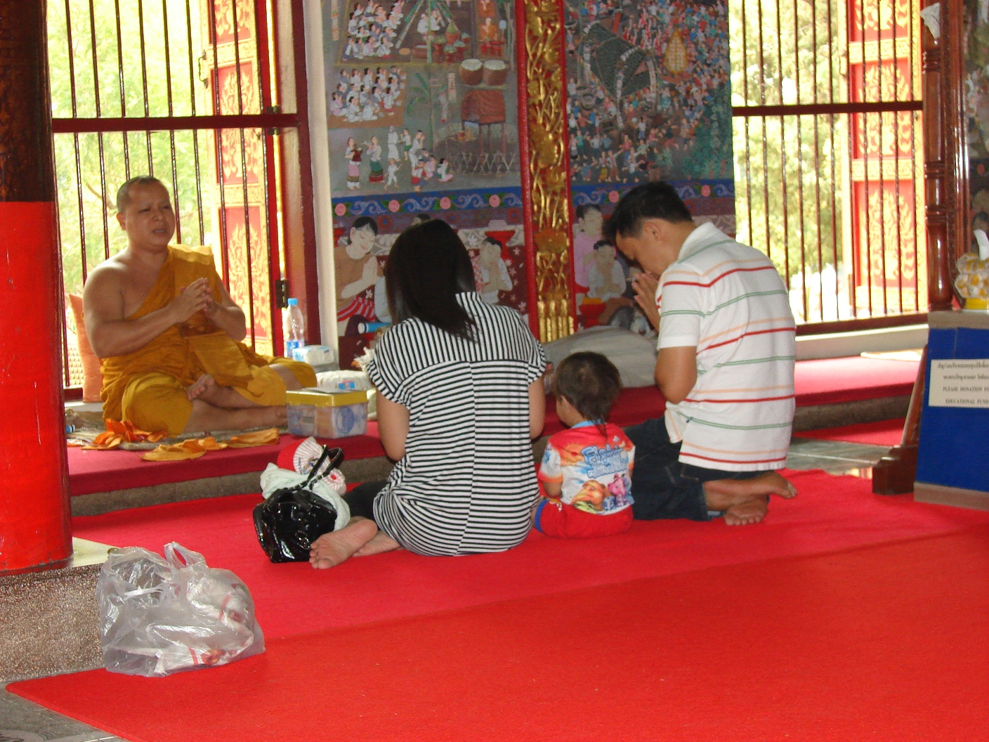 Eine junge Familie bringt einem buddhistischen Mönch Opfergaben